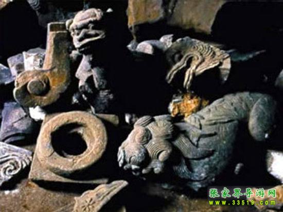 土司古墓群多集中于司城紫金山、雅草坪、帕桶湖三個(gè)地方,其中以紫金山最多。據(jù)勘察,紫金山一處共有土司王及其貴族墳?zāi)?09座。彭福石沖以后的土司、土官及其眷屬,都分別埋葬在這里。古墓的規(guī)模大小,視其官爵而定。從已挖開的30多座古墓來看,基本形式是用土磚拱成半圓形,墓前有石人石馬,四周筑有圍墻,進(jìn)出必經(jīng)鐵門。墓室四壁上刻有精美的花草圖案和龍鳳圖案。棺材系楠木、梓木做成,用土漆漆成烏黑色,并用鐵鉤懸掛在石室之內(nèi)。隨葬器物也極為豐富,有金花、金譬、發(fā)插、耳環(huán)、蓮蓬等金銀飾物,還有各種玉器等。明代一些名土司彭顯英、彭冀南等人的墳?zāi)怪两裆斜4嫱旰谩9拍谷含F(xiàn)為湖南省重點(diǎn)文物保護(hù)單位。