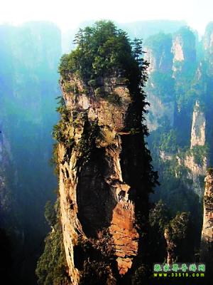 憑欄俯視,300余米高的峭壁猶如斧劈,草木叢生,幽洞玄奧,但聞水聲,不見溪谷。溪畔50米處一巨峰高達(dá)300余米,腰圍數(shù)十米,渾圓如柱,雄偉離奇。相傳共工與顓頊爭(zhēng)奪帝位失敗后怒觸不周山,折了天柱,飛來半截于此,故名乾坤柱。爾后許多神仙云游此地,留下不少古跡。此柱南有數(shù)條直達(dá)山頂?shù)木G色峽谷,似神仙往來的通道。右邊一峰柱,上不有如一只皮靴,稱神靴巖,相傳是曹國(guó)舅扔下的一只不合腳的靴子。觀景臺(tái)右側(cè)那株根部彎曲的古松名鐵拐松。