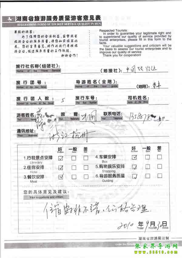2010年9月30日菜小姐一行5位旅游質(zhì)量反饋:住宿安排不錯(cuò),價(jià)格合理